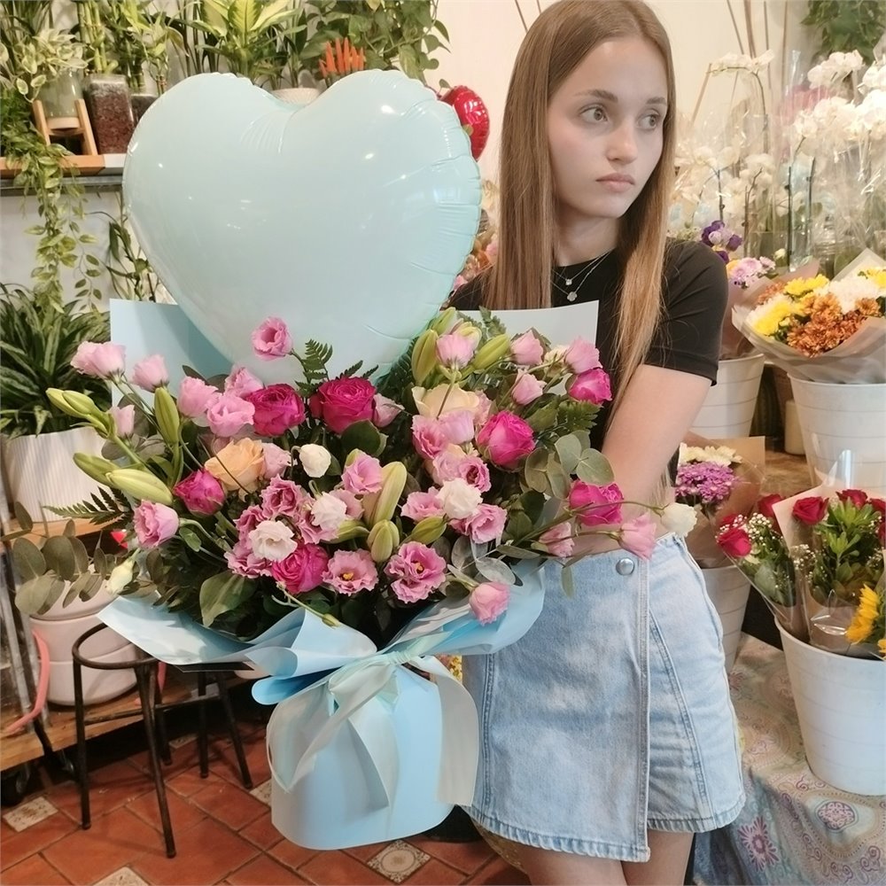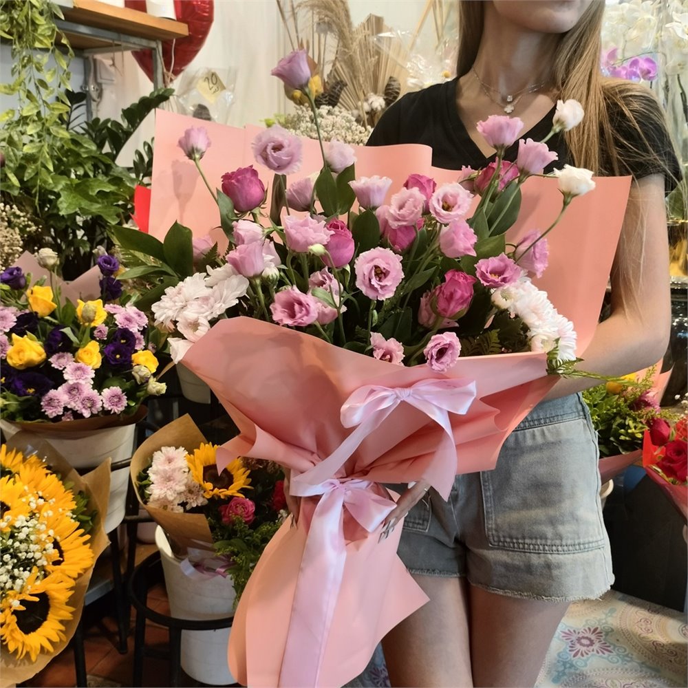 זר קופצני שובב ואסימטרי, מגיע בגווני ורוד או לבן או סגול, עטוף שכבות ורודות בתמונה הגודל הרגיל!