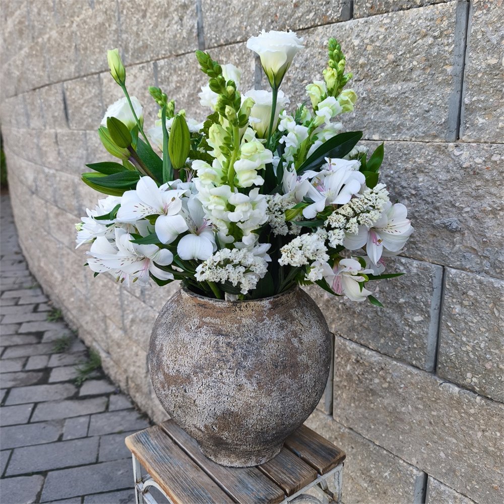 שלל פרחים לבנים אלגנטים מסודרים באגרטל במראה מיושן מתנה מהממת לכל מארחת בכל סגנון- אלגנטי או כפרי